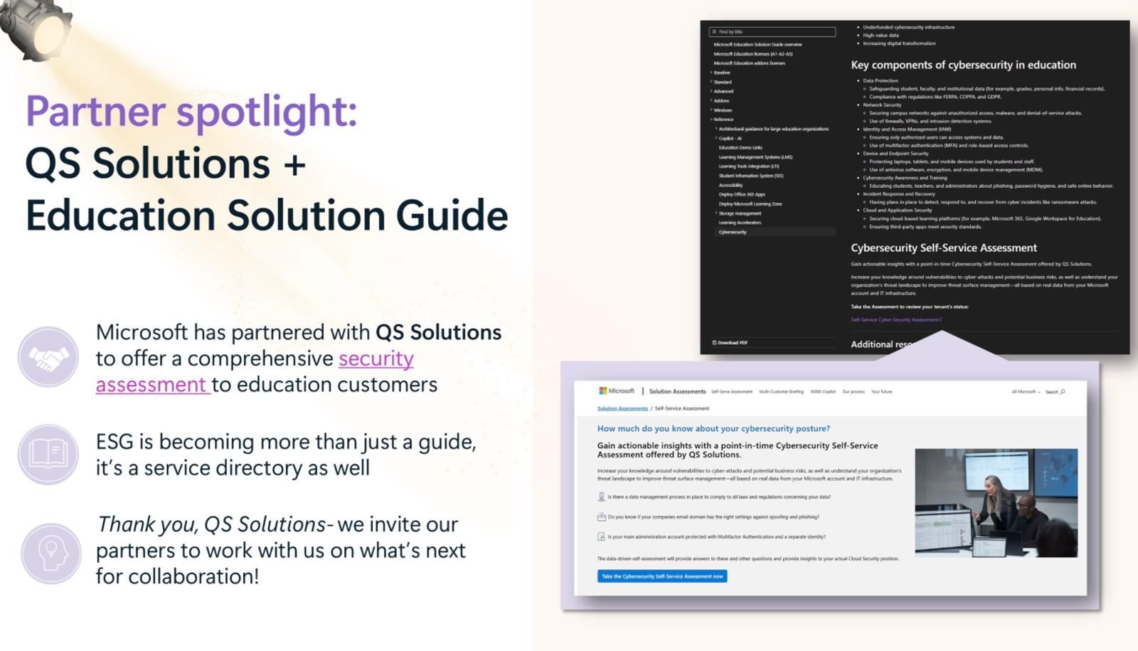 During Microsoft Reimagine Education 2025, the Cyber Security Assessment Tool (CSAT) from QSBN was highlighted by Deirdre Quarnstrom, Vice President of Education at Microsoft. This recognition officially positions qs solutions as a trusted provider of security assessments for the education sector.